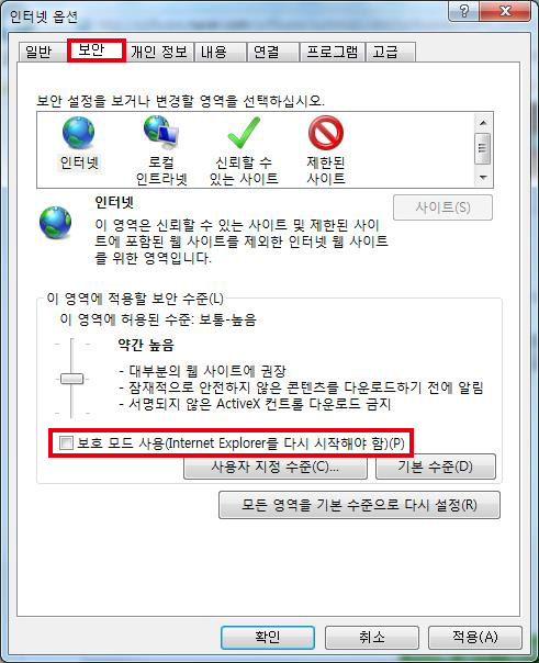 2. [ÀÎÅÍ³Ý ¿É¼Ç] - »ó´Ü¿¡ ÀÖ´Â [º¸¾È] ÅÇÀ» Ŭ¸¯ ÈÄ, ¾Æ·¡¿Í °°ÀÌ [º¸È£ ¸ðµå »ç¿ë(Internet Explorer) ´Ù½Ã ½ÃÀÛÇØ¾ß ÇÔ)]¸¦ üũ ÇØÁ¦ ÇÑ ´ÙÀ½[Àû¿ë] - [È®ÀÎ] ¹öưÀ» Ŭ¸¯ ÇÏ½Ã¸é µË´Ï´Ù.